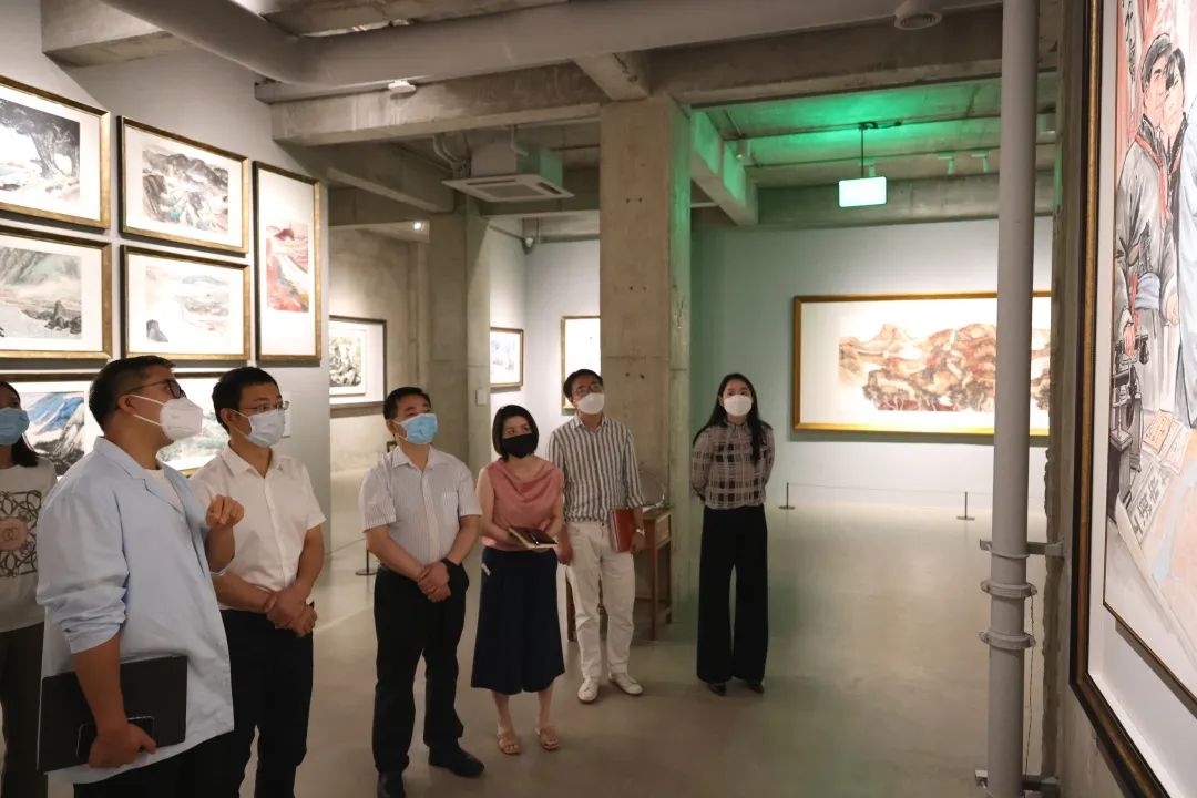 张国强副局长一行首先来到园区内的上海艺术百代美术馆,助理馆长徐金明先生向领导一行详细介绍了《奋斗》展的展览作品,展览取得的各项成果和收尾工作,以及新展《城·长》的前期筹备情况。在调研过程中,张国强副局长一行在美术馆工作人员的介绍下认真细致倾听了部分画作的创作故事以及展览的策展思路。