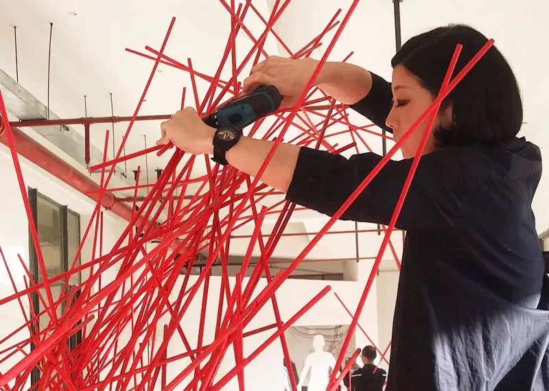 日本艺术家吉元烨子运用了花道草月流的技术,经过6个日夜和无数根红色细木棒搭建成装置作品《事象地平线》,既纷乱又有序,既稳固又脆弱,令人过目难忘。她想表达在我们艰难的生涯中,随时可能经历“黑洞”,那种苦恼、辛苦、痛苦、绝望仿佛要把我们吞噬,几乎把我们从宇宙脱离而去。但我们可能因为爱一个人,爱我们视界所及的光,爱着身边的一切,使我们选择留在宇宙。人表面的状态会改变,但是生命将再次聚集力量,再次诞生,宇宙的信息也是这样。吉元烨子希望自己的作品《事象地平线》能够有重新出生的意义:它象征着希望和光明。