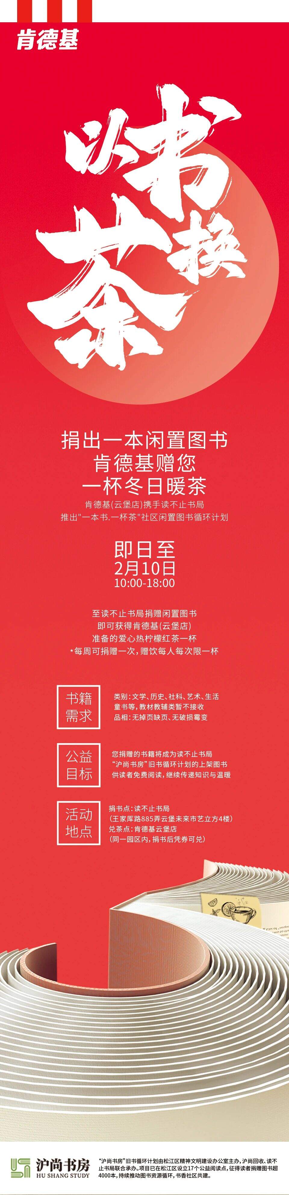 即日起至2026年2月10日(10:00-18:00),您只需前往读不止书局,捐赠1本及以上符合要求的闲置图书,即可获得由肯德基云堡店为您精心准备的爱心谢礼——热柠檬红茶一杯。